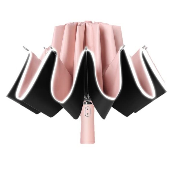- One-touch Automatic Open and Close Umbrella: This folding umbrella can be opened and closed easily with one hand. One push to restore Even if the umbrella bounces back over due to strong winds, you can simply press the button to recover its original appearance. This folding umbrella is convenient when you have a lot of luggage, when you get in or out of a car or bus. This folding umbrella is equipped with reflective tape, so it can be seen on rainy days, night roads, or bad visibility. It also increases visibility of the driver and avoids the danger of accidents. This is a large size and lightweight reverse umbrella that reduces UV rays and is packed with all the features you wanted, such as 100% blackout umbrella