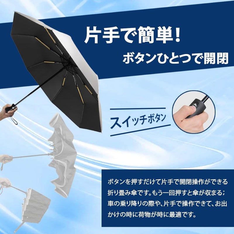 - Easy to operate with just one touch! One-hand automatic open/close umbrella for both sun and rain. It can be opened and closed easily with the press of a button with one hand. It is very convenient when carrying luggage, getting in or out of a car or bus, and can quickly respond to sudden weather changes. A must have item for your busy life without any stress