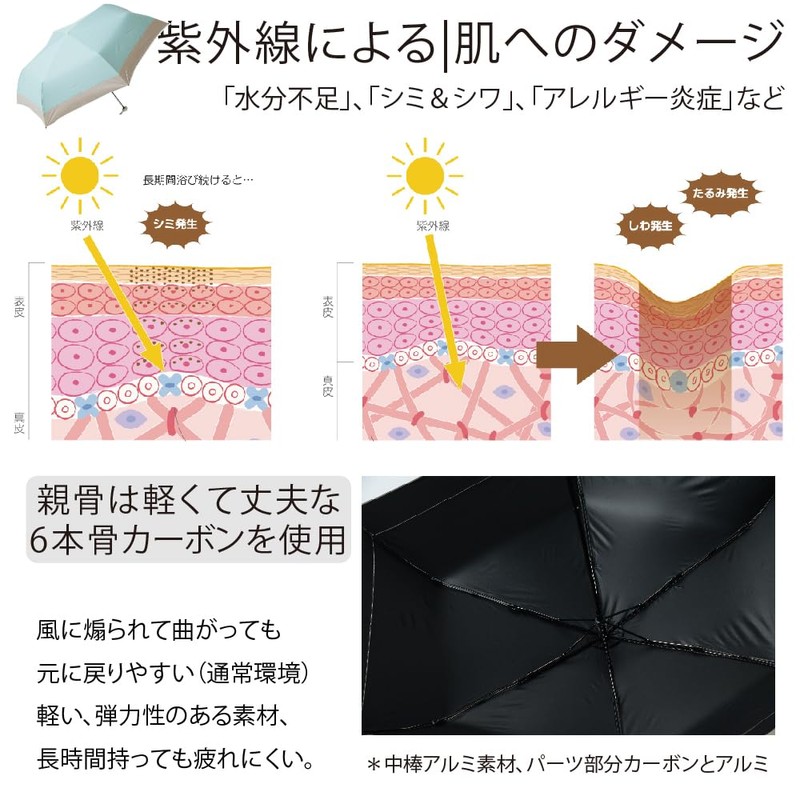 - (Rain or Shine/Rainy Weatherproof) Adopts a high-density 30D ultra-lightweight NC fabric and water-repellent umbrella cloth that has a higher water repellency than ordinary parasols, allowing you to drain in a short time. Proven the highest level of water repellency 5. Just shake it lightly to shake it off. Waterproof and safe for rainy days. It repels rain water and is odor-free and comfortable to use. Super water repellent, water droplets can be easily swapped off with a light shake. Made of 310T high-density water repellent material, the rain will roll down like a beads. It has superior water repellency than ordinary umbrellas, and just shake it off the rain water. No more worrying about rain getting through even after long periods of use. You won't be bothered by people in public places such as trains. The fabric is also stain resistant and stain resistant. The shaft is made of sturdy aircraft aluminum alloy, 6 ribs made of fiberglass and aircraft aluminum alloy. Durable It will return to its original even if it is flipped over in strong winds