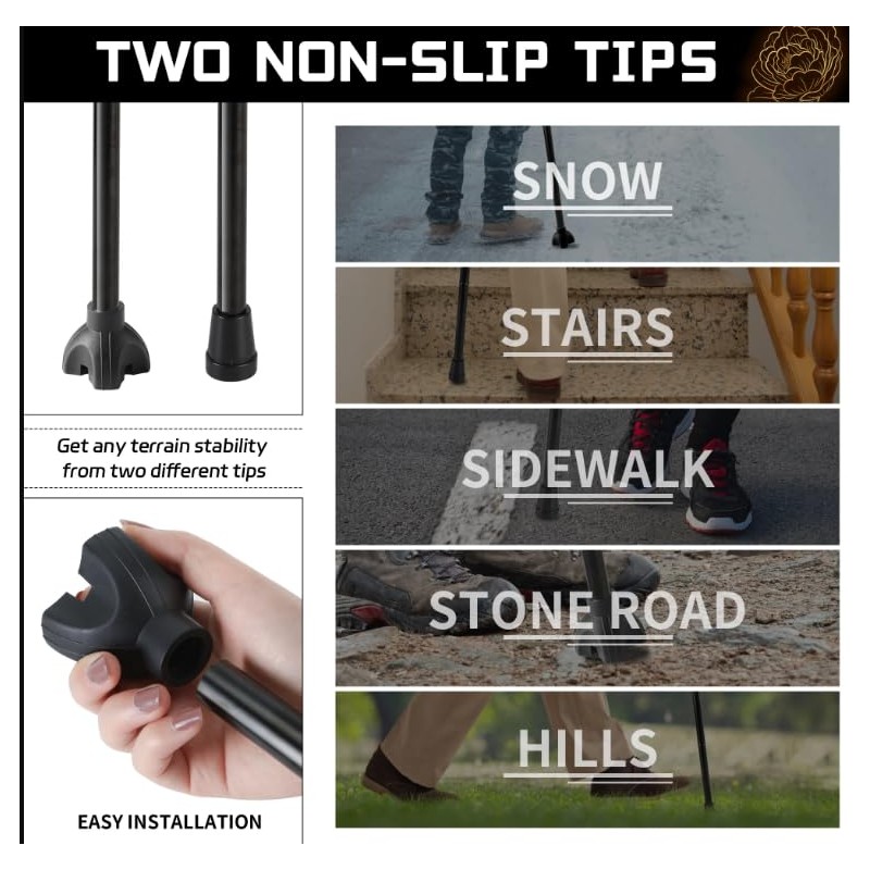 - Replaceable Cane Tips - An extra wide base helps the crutches stand on their own. Another common base is easy to carry. The anti-slip design provides a good strong grip, giving the cane excellent anti-slip properties and wear resistance to walk on any surface