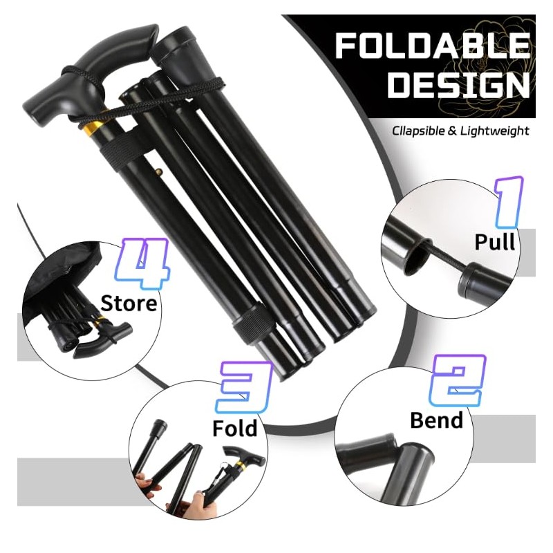 - Guarantee Measures - Collapsible cane anti-slip wrist strap to prevent the hand from accidentally slipping while hanging, freeing the hands when not needed; Additional safety locks, locking rings stop the cluck of the cane and ensure it stays in place after adjustment. The folding cane is suitable for all kinds of occasions in life: walking, shopping, traveling, etc.