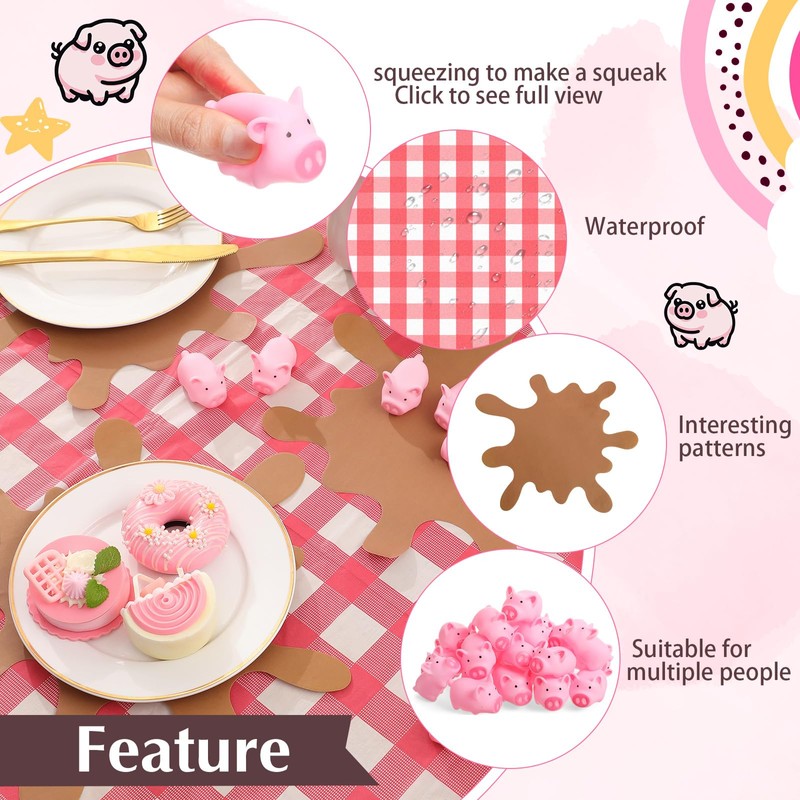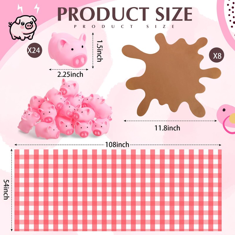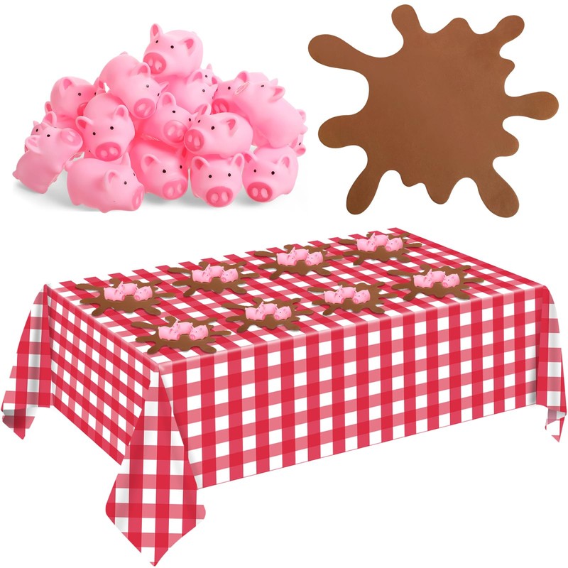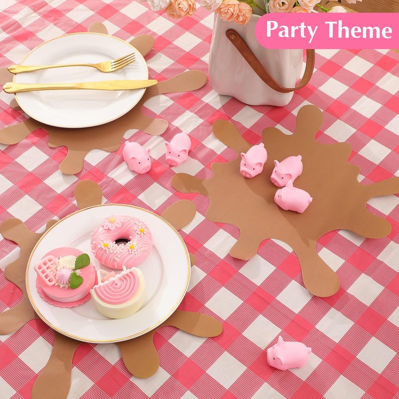 - Pig Birthday Decorations: transform your celebration with our pig birthday party supplies, which includes your need for a memorable event; The set features 24 mini rubber pigs, ideal for interactive fun and as playful party favors; Additionally, you'll receive 8 muddy puddle shaped placemats; There are also include 1 red and white checkered tablecloth, making it easy for you to create a fun and inviting environment for your guests
