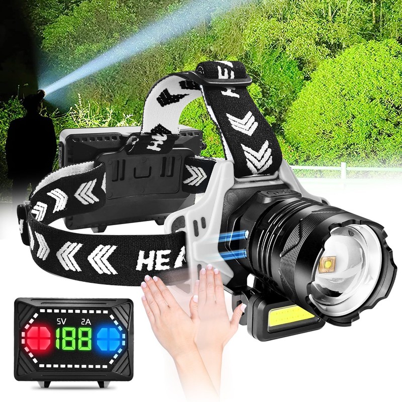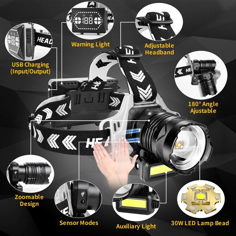 - 【Brightest 150000 Lumens Headlamp】This rechargeable headlamp with a zoomable function boasts a powerful 30W LED chip, Delivers up to 150,000 lumens, the maximum irradiation distance can reach 1000m/3280ft, USB headlights run time can reach up to 6-12 hours. Headlamp flashlights are the best choice for jogging, camping, fishing, hiking, running, and backpacking.