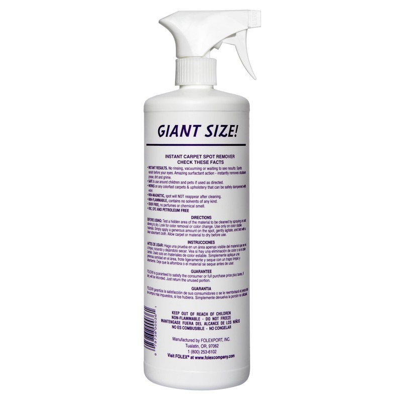 - Carpet spot removers instant VALUE size 36 fl. oz. Safely removes tough spots and stains from colorfast carpet, rugs, upholstery, and clothing. Does not leave a sticky residue. No rinsing or vacuuming necessary.