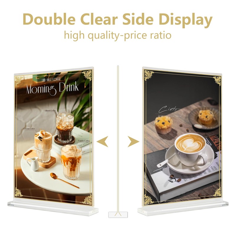 - 🟩T-shaped appearance: This acrylic sign holder has a beveled T-shaped design, both sides are same for displaying pictures and announcements.