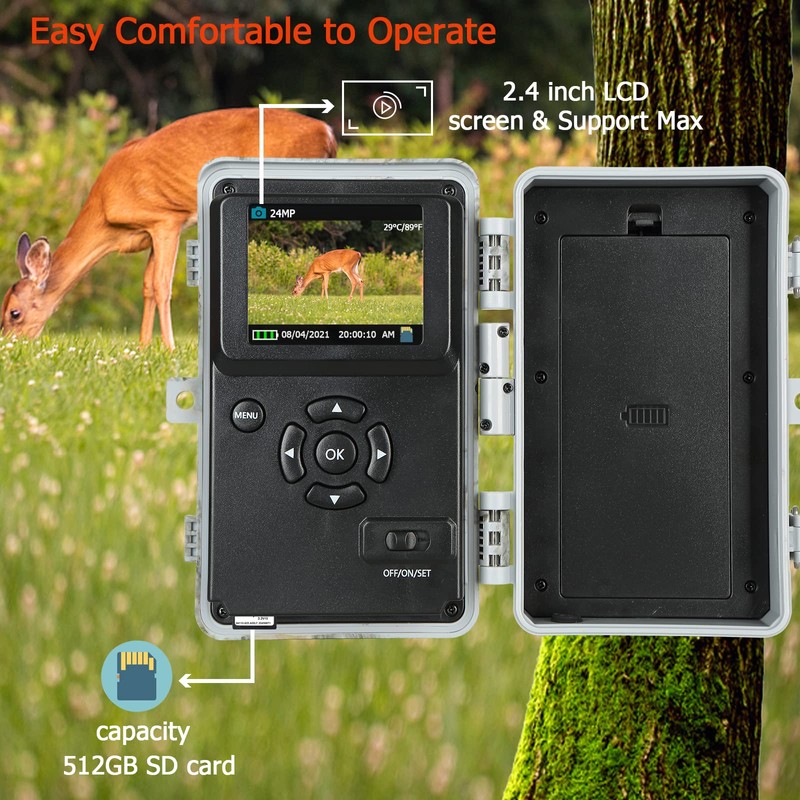 - [24MP Photo + 1296P HD Video] This hunting camera captures sharp and clear 24 megapixels and 1296P HD videos. An SD card (not included) can take thousands of high-quality photos and hours of videos.