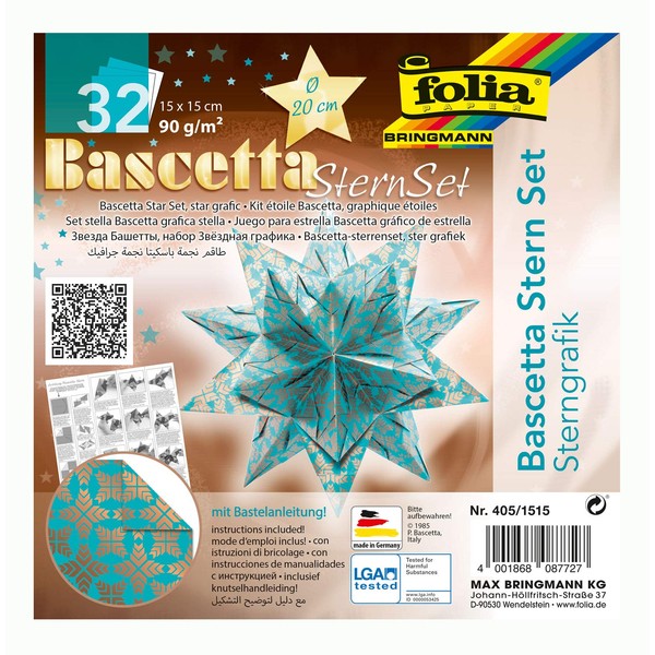 folia 405/1515 Bascetta Star Graphic Craft Set Turquoise/Copper 32 Sheets 15 x 15 cm Finished Size of Paper Star Approx. 20 cm with Detailed Instructions (English Language not Guaranteed) Ideal for