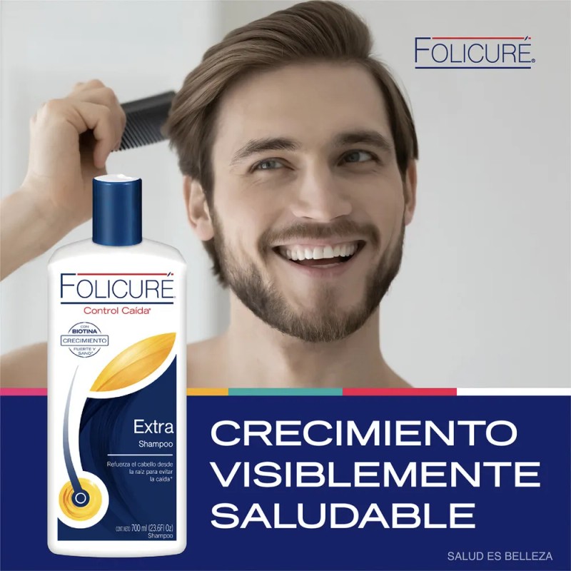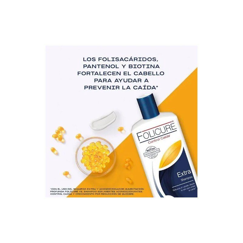 Refuerce su cabello desde la raíz hasta las puntas para evitar su caída con nuestro Shampoo Control Caída Folicuré Extra, que fortalece su cabello y ayuda a su crecimiento, haciendo que luzca visiblemente saludable y limpio desde el primer uso. Creado por los expertos en caída del cabello, el Shampoo Control Caída Folicuré Extra trabaja a nivel de la raíz del cabello, reforzándola y disminuyendo así la caída. Su exclusiva fórmula avanzada contiene biotina, ingrediente que ayuda al crecimiento fuerte y sano del cabello, y está enriquecida con Folisacáridos y pantenol, que actúan directamente desde la raíz hasta las puntas para fortalecer la hebra del cabello y prevenir la caída. Para disfrutar de los beneficios a largo plazo del Shampoo Folicuré Extra, aplíquelo diariamente en el cabello mojado, masajeando suavemente. Luego, enjuague bien. Si quiere obtener aún mejores resultados, aplique inmediatamente después el Acondicionador Humectación Profunda Folicuré de medios a puntas del cabello, para complementar así su tratamiento anticaída. Deje que su cabello crezca sano y fuerte. Folicuré, la marca experta en caída del cabello con resultados visiblemente comprobables, para un cabello más resistente, humectado y hermoso. Con el uso del Shampoo Extra y Acondicionador Folicuré Humectación Profunda en comparación con un shampoo sin agentes acondicionantes. Control caída y crecimiento por reducción de quiebre.