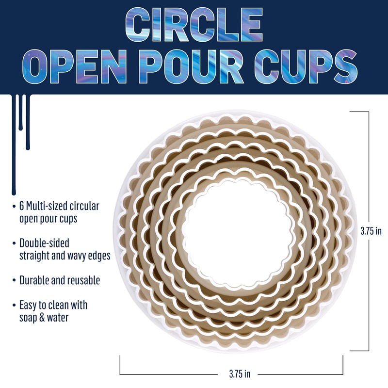 - EXPLORE OUR DRIZZLE TOOLS – The FolkArt Drizzle Circle Open Pour Cups set includes 6 circle open pour cups that have double-sided straight and wavy edges for creating unique fluid art.