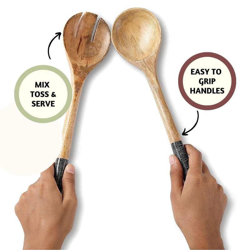 - SAFE & HEALTHY COOKING- Safe to use wooden spoon and wooden fork on nonstick cookware to add a twist to your kitchenware. These mango wood salad servers or tossers are organic and eco-friendly and do not contain any pesticide or fertilizers. Our serving spoon have a lovely print and are food safe.