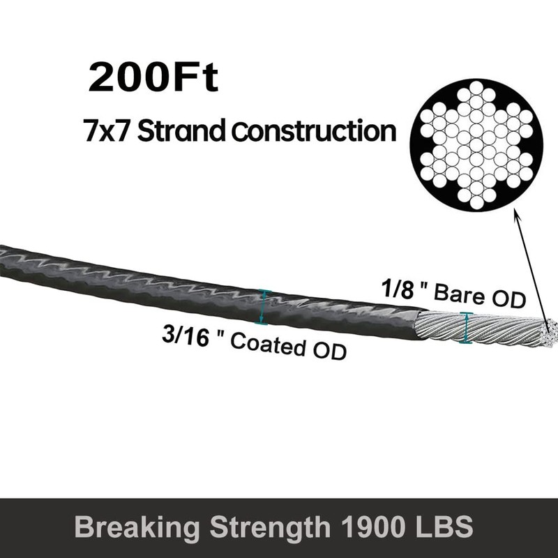 - 【Size】 Cable bare OD is 1/8 inch,Black vinyl coated OD is 3/16 inch,Construction: 7 x 7; 304-Stainless Steel;1900 lb breaking strength.