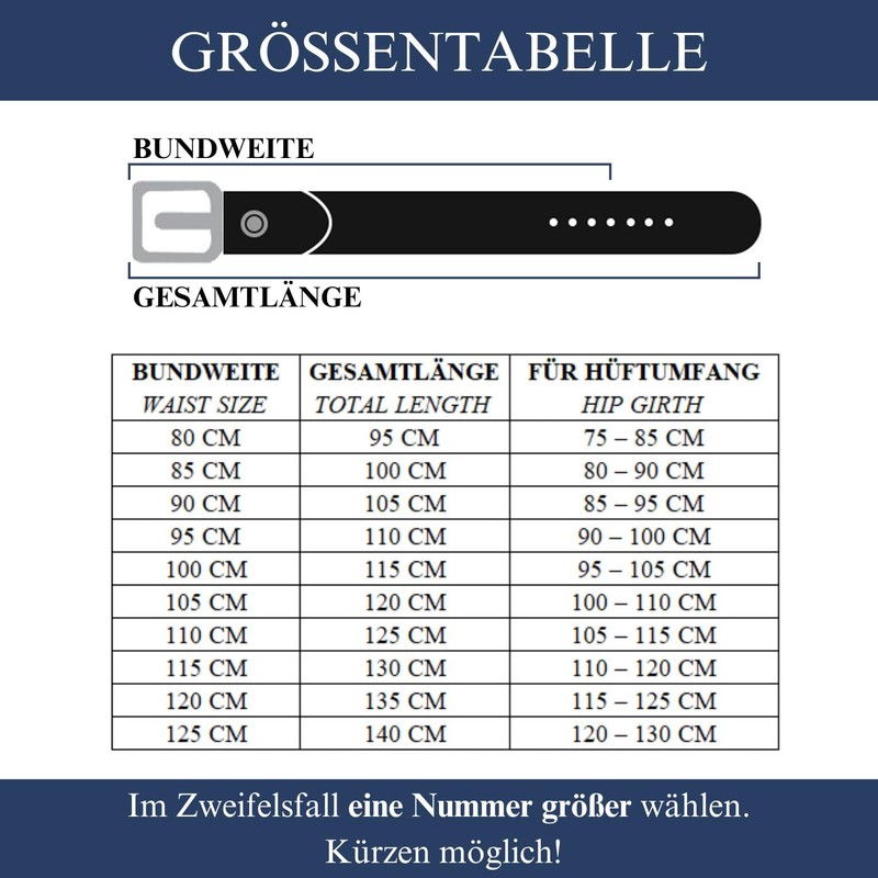 - Dimensions: the waist size should correspond to your body circumference at belt height and is approx. 105 cm, the total length of the belt is approx. 120 cm, width approx. 38 mm, thickness approx. 3 mm