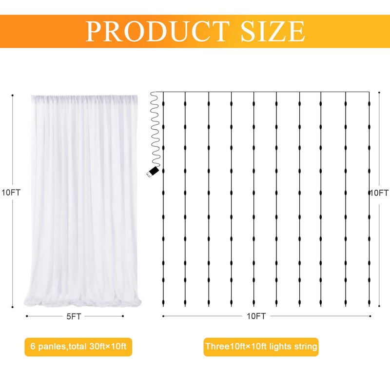 - Package Includes: The package includes 6 panels White sheer tulle backdrop curtains, each curtain backdrop is 5FT width and 10FT height. Also it includes 3 set of 10FT (10 strands) warm string light (USB Powered) and 36pcs transparent clips.