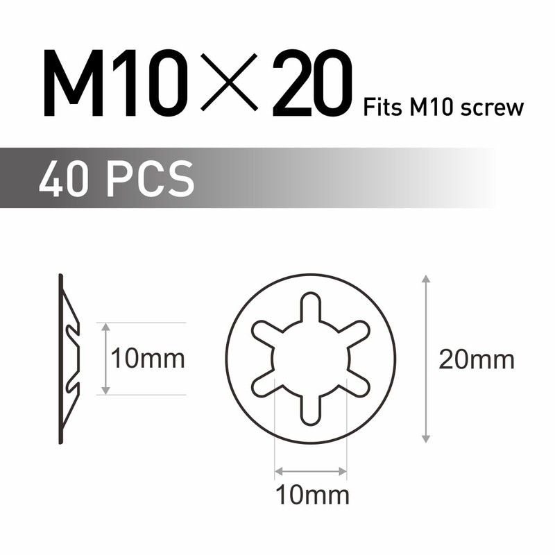 • Packing list: 40 pieces M10 x 20 (inner diameter x outer diameter) stainless steel safety washer.