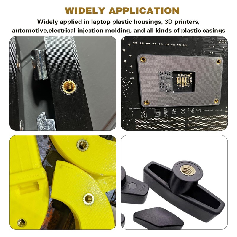 - Versatile Compatibility with Plastics: Designed for all thermoplastics, including PLA, PETG, ABS, PPS, PP, and more, these inserts find applications in 3D printers, electrical molding machines, automotive plastic shells, and laptop molds. Their versatility ensures compatibility across a wide range of materials.