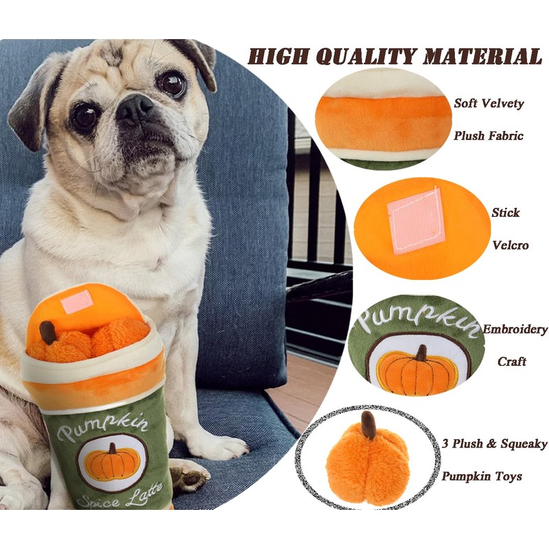 - It comes with a crinkly coffee cup and set of 3 soft squeaky pumpkins which can be played like little balls to fetch