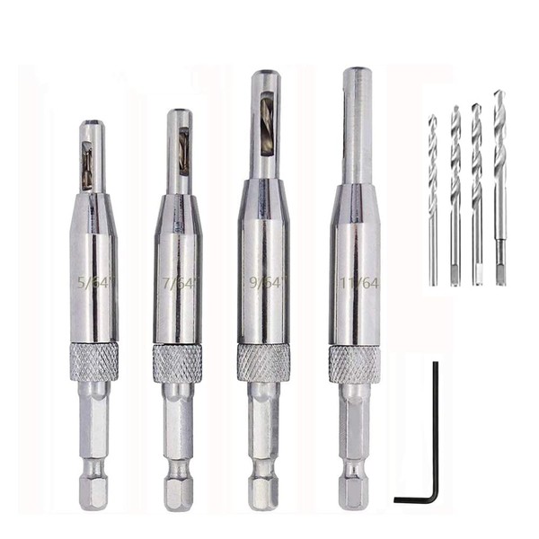 Fongmore 4 Pieces 5/64 7/64 9/64 11/64 Self Centering Drill Bit Set 1/4 Inch Hex Handle for Wooden Door and Window Hinges with Hex Key L 4 Drill