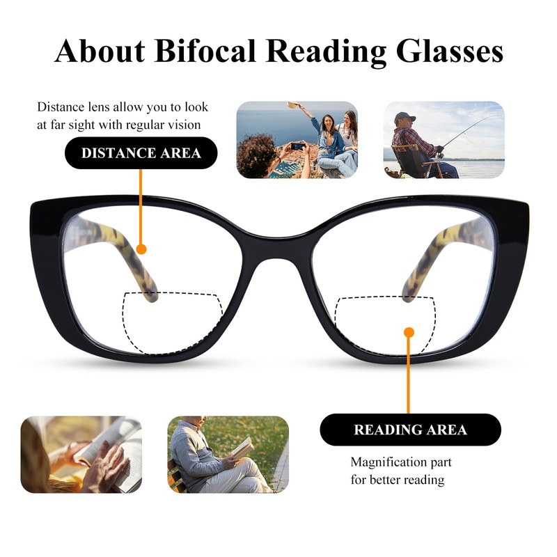 - BIFOCAL READING LENS - Get the best of both worlds in one pair of readers. These bifocal reading glasses for women feature a magnified reading segment at the bottom of each lens while keeping the upper portion unmagnified. This smart design allows you to keep your glasses on at all times—whether you're reading up close or looking up to converse with someone.