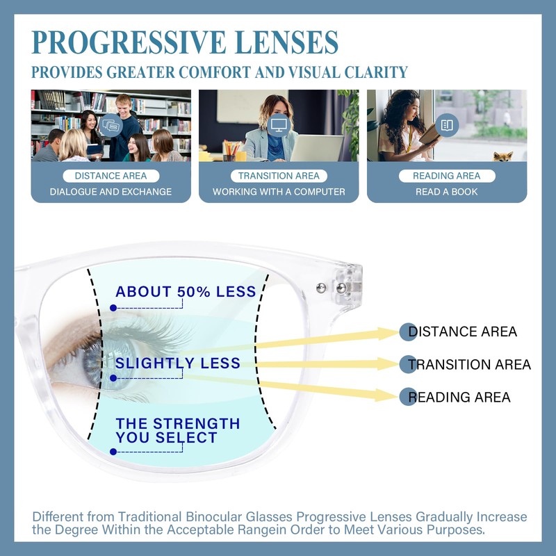 • ▶COMFORTABLE WEARING- Our progressive readers are expertly crafted from polycarbonate, making them both featherlight and durable. The lightweight material reduces pressure on your nose bridge, providing maximum comfort. The classic square frame is perfectly suited for a variety of face shapes and hair styles.