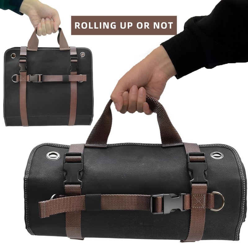 - Compact & Portable = Its compact design makes storage convenient in your vehicle. Hang the roll up tool bag in a car garage workshop the adjustable shoulder strap provides easy portability, allowing you to take your tools anywhere.