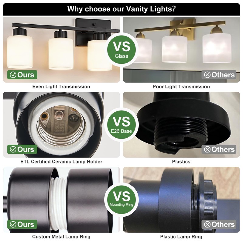 - Durable Construction: Bathroom lighting fixtures over mirror features a robust all-metal construction, including a metal securing ring that firmly holds the glass shade in place for long-lasting safety and durability. Additionally, it is built with a sturdy metal arm that remains straight and secure during use or transport, ensuring reliable performance over time