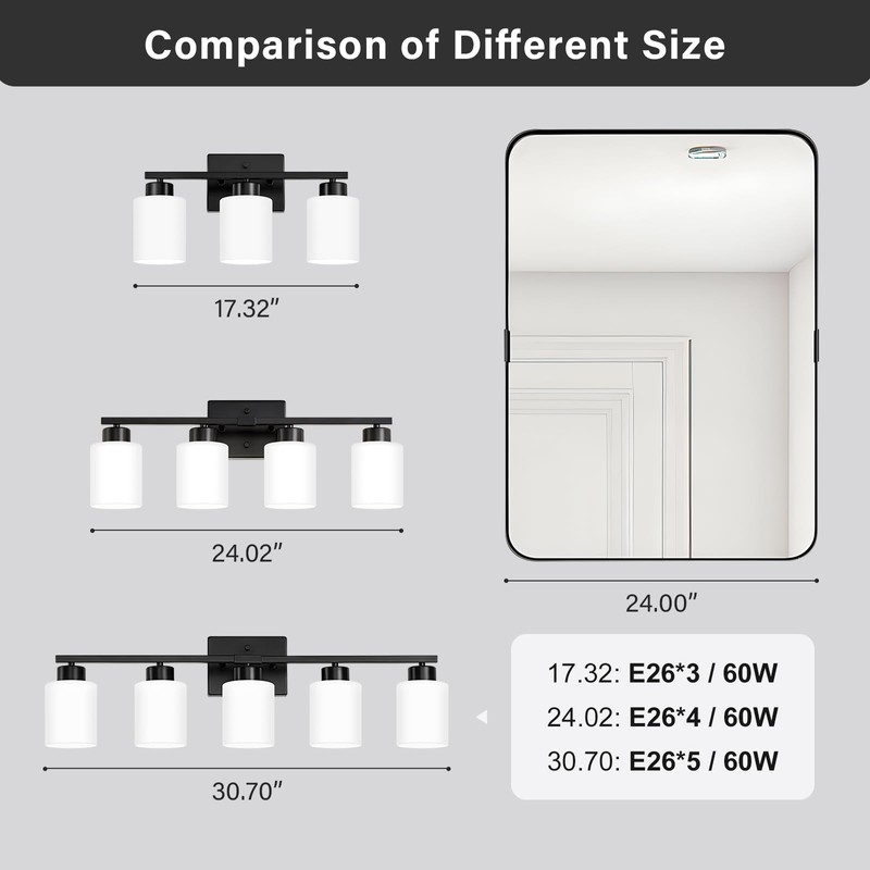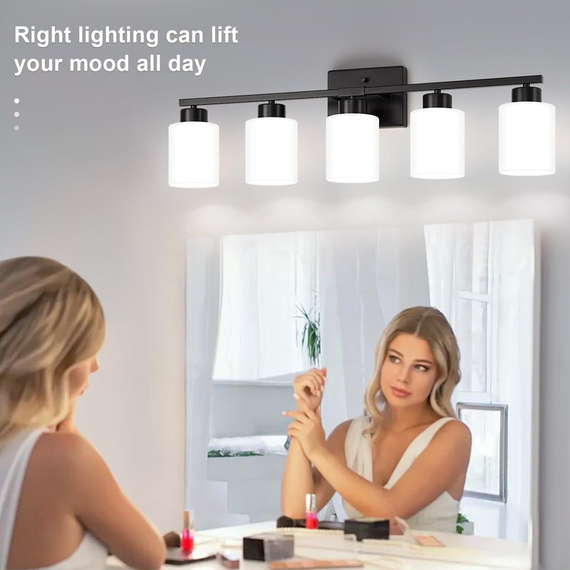 FonmYim Black Bathroom Light Fixtures, 5-Light Modern Vanity Light Over Mirror, Wall Sconces with Milky White Frosted Glass Shades, E26 Socket (Bulbs Not Included)