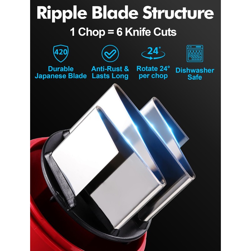 • 【Higher Efficiency】 Unique 'W' balde design enlarges cutting area and helps complete cutting. Every time you slap the chopper dicer, the blade will rotate 24° to ensure chopping thoroughly, even fewer ingredients can be chopped finer. It's a high efficient kitchen chopper that you can get what you want with a few slaps.