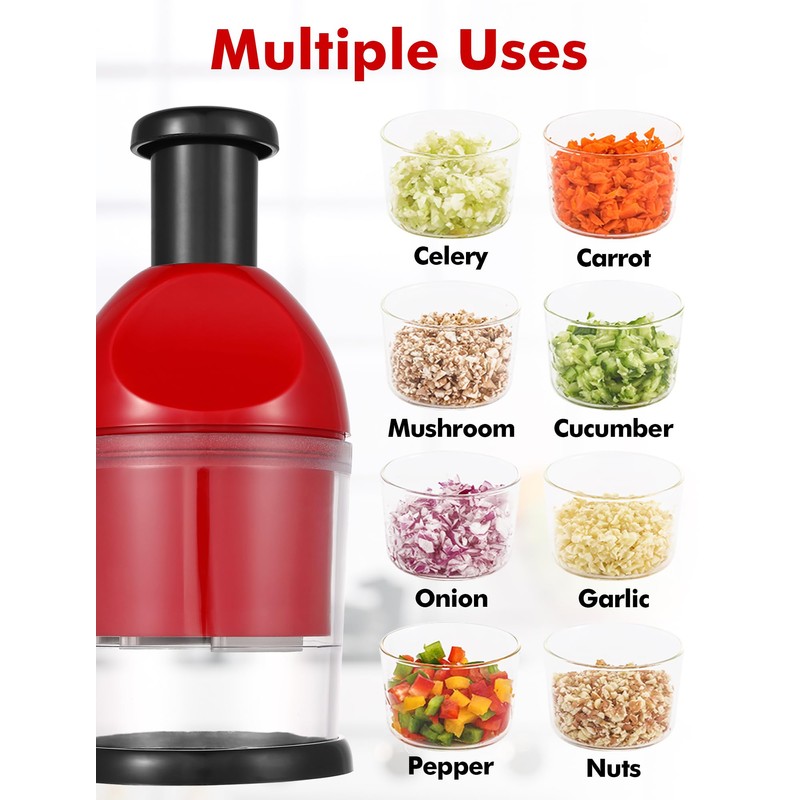 • 【Save Your Prep-Time】 The food chopper is equipped with an easy push-down presser, just press a few times then you will get everything done well as a chef. Premium stainless steel blade can help you accomplish chopping in seconds. This hand food chopper can mince onion, garlic, nuts, celery, pepper, cilantro and more, which meets every need for seasoning.