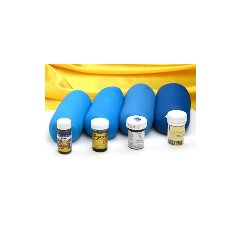 Professional colours in the highest concentration. It is enough to dye a knife tip of the paste for rolling fondant, marzipan, decorative compounds, cream, sauces, etc. For colouring liquid sugar or isomalt, use our liquid colours. Made in Germany. Ingredients: water, sorbitol syrup, thickener: modified starch; dyes: E 124*, E 133, E 104*; preservative: E 211, E 202. (*May affect activity and attention in children) Due to the high concentration of dyes, the consistencies of different colours may vary. Compare for yourself how intense our paste colours are. In picture 2: left three well-known competitors - right paste colour from Pati-Versand *500 g roll fondant white with 2 g paste colour blue (E133)