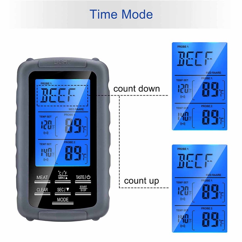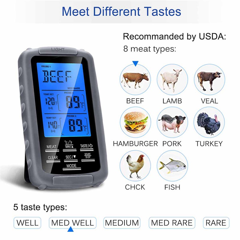 1、The transmitter probe will regularly send temperature updates to your meat thermometer; No need to keep watching on monitoring and free your hand; When the temperature get to the target temperature or finish the time you set, this digital meat thermomete 2、8 types of preset meats: beef, lamb, veal, fish, chicken, turkey, pork and burger; 5 levels of preset doneness: well, med well, medium, med rare and rare; Press and hold 3、The digital large backlit LCD display screen make you easy to read and record the data, especially in the darkness or low light condition; Note after 3 seconds without operation, the backlight is switched off 4、The meat thermometer has automatic calibration functions with high precision temperature measurements; The temperature test range is -4 -4 572°F, and the accuracy between transmitter and receiver is ± 1,8 ° f / 1 ° c 5、CERTIFIED: CE, ROHS, FCC, FDA ensuring a high quality product; The probes of the Estink thermometer are made of food-grade stainless steel with FDA certification, and its step-down tip design makes the temperature more accurate and faster to test; Probe