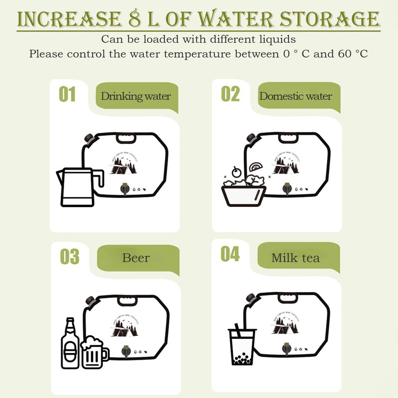 - 8L : Double your water storage with 8L containers—perfect for extended outdoor adventures! Enjoy easy, mess-free serving with our convenient rotary faucet. Ideal for hiking, camping, and beyond!