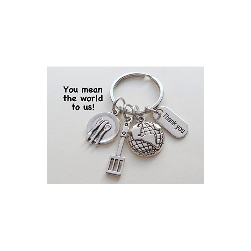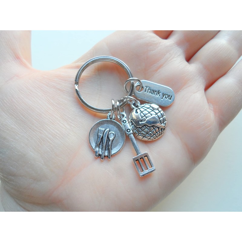 - A keychain with a globe charm, spatula charm, dinner plate charm, and a Thank you charm.
