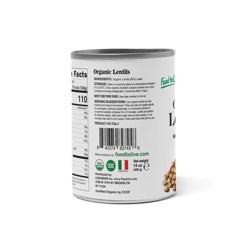 Food to Live Organic Canned Lentils, 14 oz (Pack of 8) – Unsalted, Non-GMO, Vegan. Ready to Eat. Perfect for Salads, Soups and Quick Meals. Wholesale