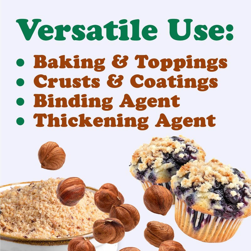 - ✔️ SUPER VERSATILE PRODUCT: Use Organic Ground Hazelnut Meal for baked goodies, homemade granola, raw desserts, no-bake nutrition bars, and even as breading for fried fish and chicken. Create famous Keto bread, Paleo brownies, Vegan Cookies, and a variety of delicious nutty cakes. Add to sweet and savory sauces as a thickening agent.