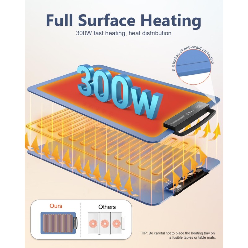 - MORE CONVENIENT DESIGN: Our silicone heating mat for food provide a fast and efficient heating experience. The power of 300w allows for faster heating compared to lower power heating devices. Our food warming mat come with a 6.6 ft power cord, so you can easily adjust the placement of the electric warming tray as needed to make it work for any occasion