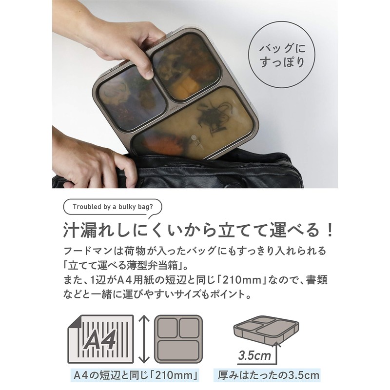 - Stand up and carry: This bag is full of luggage. The Foodman is a thin lunch box that can be stored neatly in such bags. The same 210mm as the short side of the A4 paper, so you can carry it with your documents and other items without having to worry about it. Since you don't have to carry a lunch tote or other items, you won't have to worry about adding more luggage to your work or school