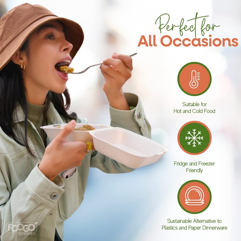 - FOOGO disposable plates, bowls and trays are compostable and biodegradable and allow easy and safe disposal without damaging the environment. In addition, they are microwave and freezer safe, perfect for hot and cold food.