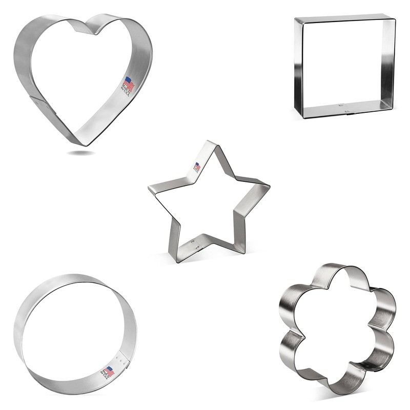 - Foose Cookie Cutters Basic General Cookie Cutter 5 Pc Set, Tin Plate Steel, Silver Color, Handmade in the USA. See images for Sizes. Scallop Flower 3.75 in x 3.75 in, Heart 3.75 in x 3.5 in, Star 3.5 in x 3.25 in, Square 3 in x 3 in, Round Circle 3.5 in diameter. Cutting depth 1 in.