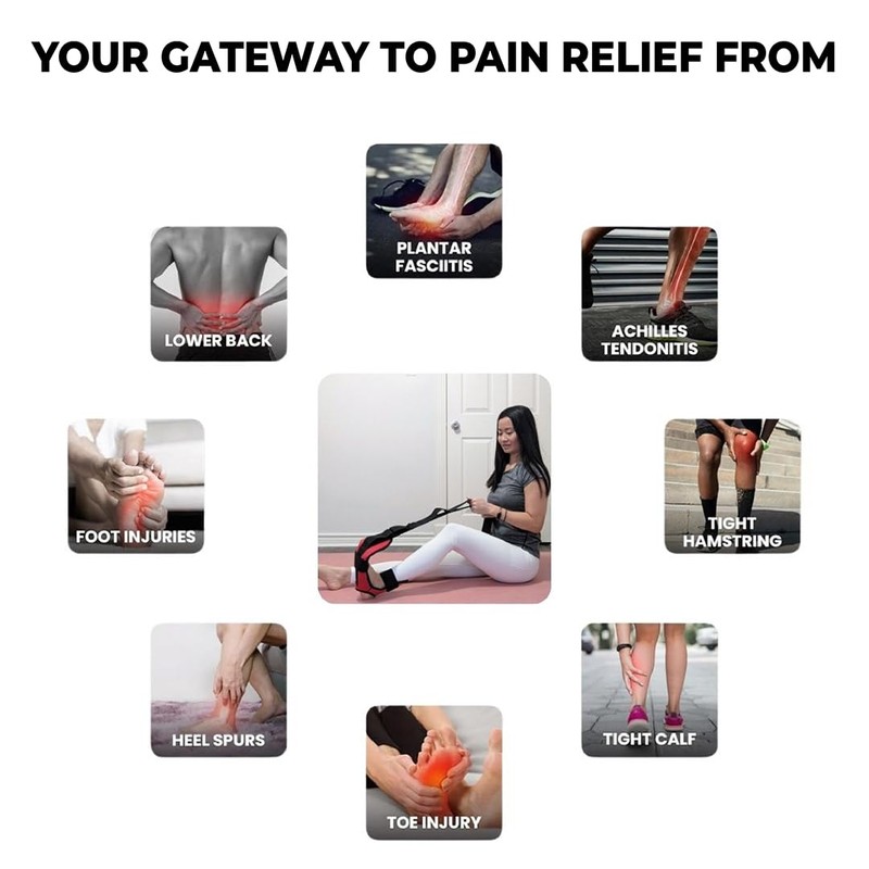 - Relieve Plantar Fasciitis Pain: The foot stretcher for Plantar Fasciitis aids in stretching the plantar fascia ligament, reducing pain associated with plantar fasciitis, heel spurs, achilles tendon, drop foot, hamstring and other foot conditions. Experience relief and improved mobility with regular use of YAGHZU leg stretch strap