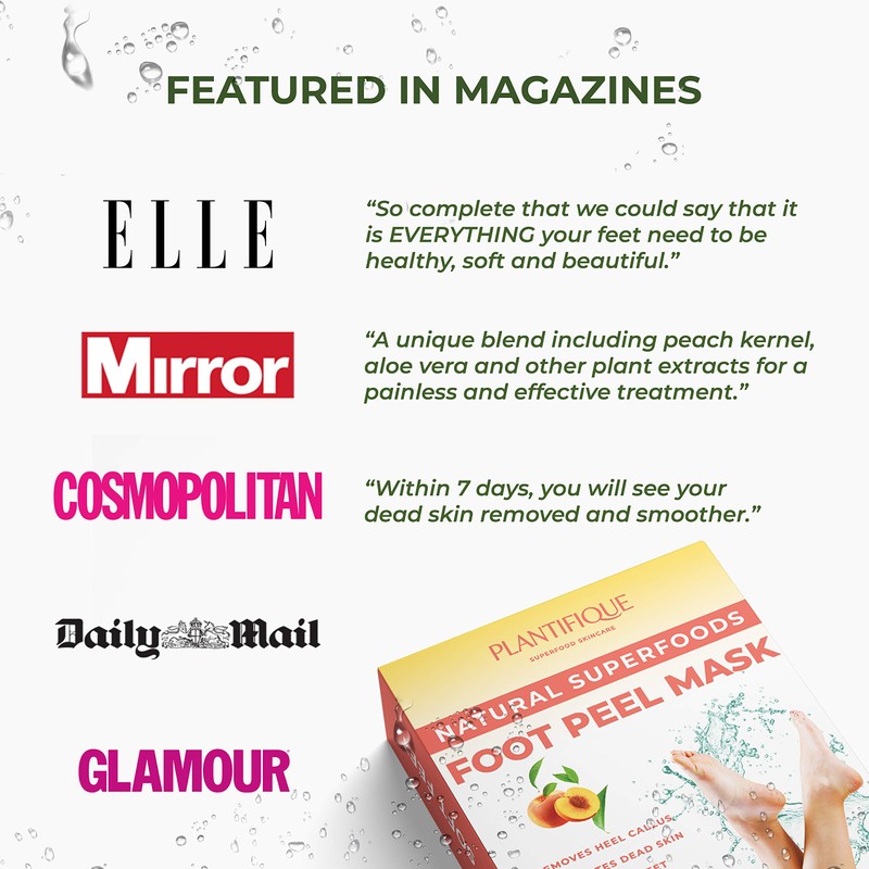 - As seen on Elle, Cosmopolitan, and others. Our peach foot mask has been featured and recommended by numerous magazines such as Daily Mail, Mirror, Glamor, Elle and Cosmopolitan!