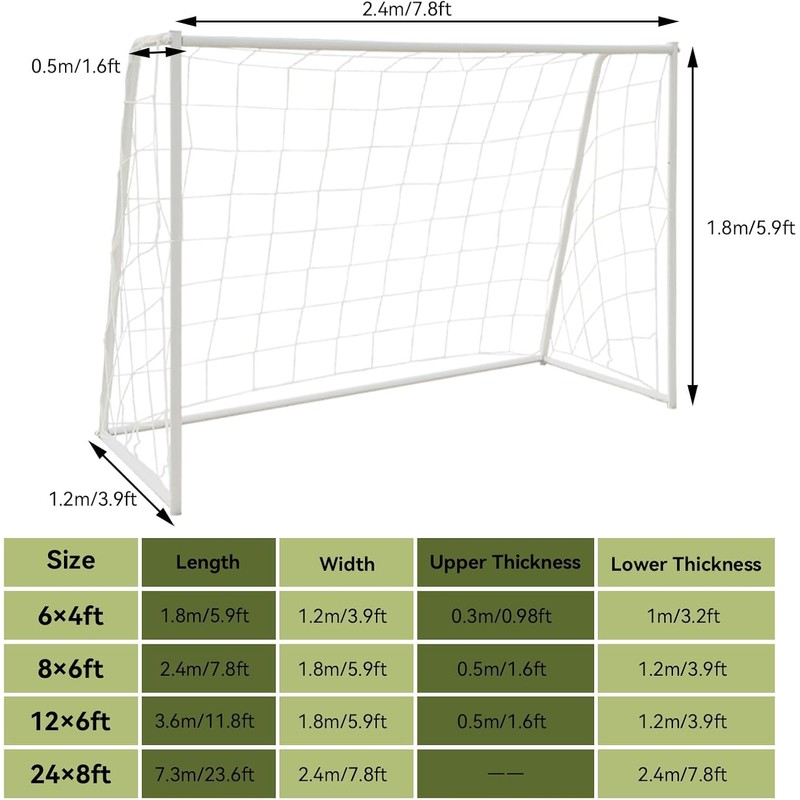 Material: Soccer goal net made of quality cotton, durability. Multiple Sizes: 6 x 4 foot; 8 x 6 foot; 12 x 6 foot; 24 x 8 foot, this soccer netting makes a great soccer goal for the backyard, or a great kids’ soccer goal that inspires young athletes to practice and score. Quick Set Up: Installing and removing the football net is quick and easy. You'll be able to get back to kicking in no time. Portable: Folds up to a tiny fraction for easy transport and storage. Small soccer goal is also the perfect size for your small car trunk. Soccer Goal Net Replacement: Suitable for goals with a 3-angle shape on the side or a trapezoidal shape on the side.