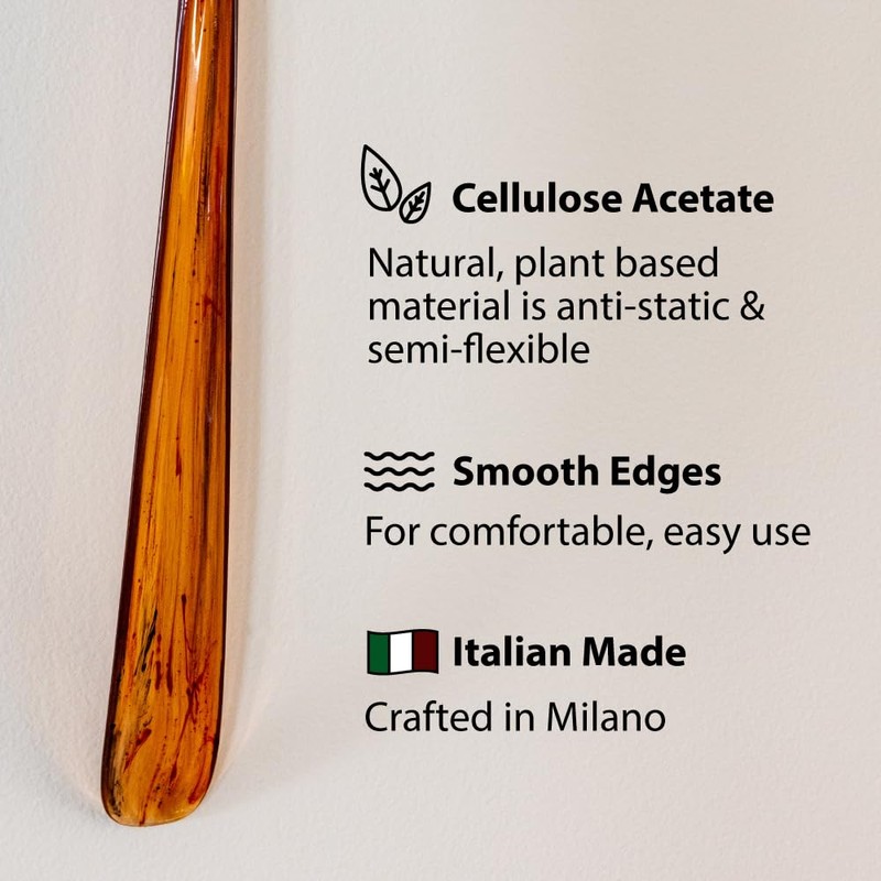 - TORTOISESHELL SPOON: The acetate cellulose spoon features rounded edges and a contoured shape to fit the heels natural shape. The acetate construction’s main benefit is that it’s naturally anti-static and flexible for that added comfort when in use.