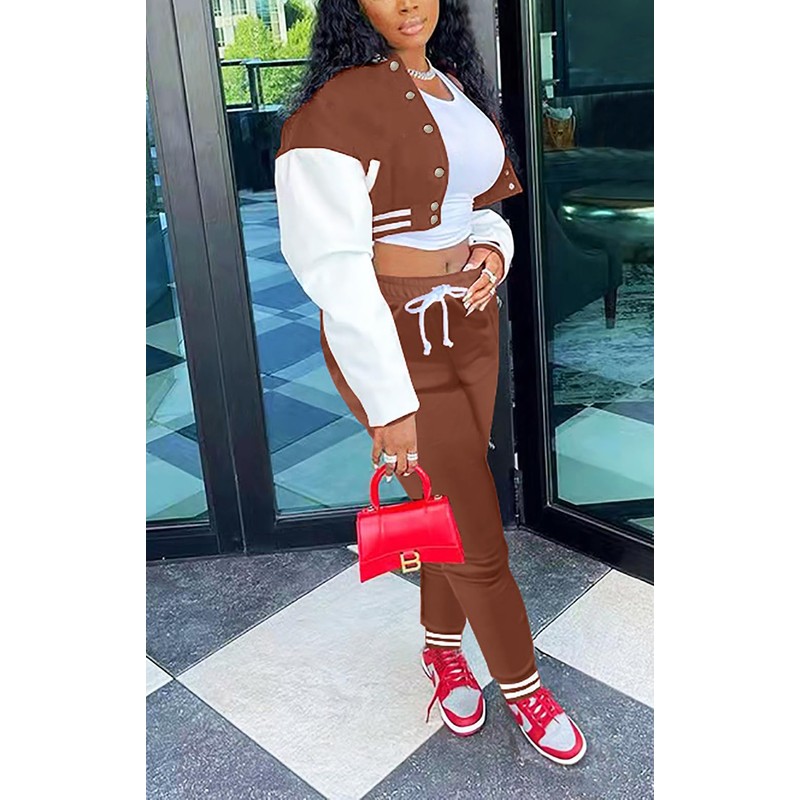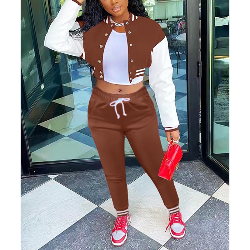 Fooullaide Women’s Varsity Jacket Sweatsuit 2 Piece Tracksuit Crop Top Button Down Letterman Jackets Pants Sets