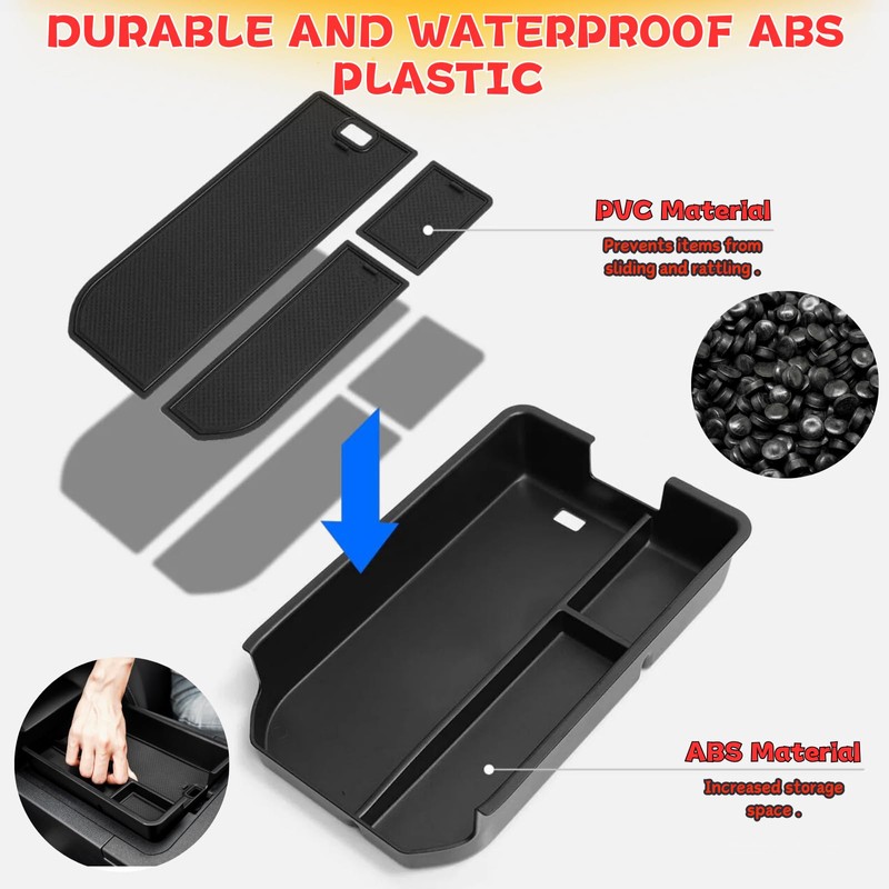 - Durable and Waterproof Material - This armrest organizer is made of solid ABS plastic with thick enough edges to not deform easily, ensuring it withstands daily use. The soft rubber padding at the bottom protects your belongings from impact and noise, ensuring a quiet ride. The black color closely matches the interior of your car seamlessly.
