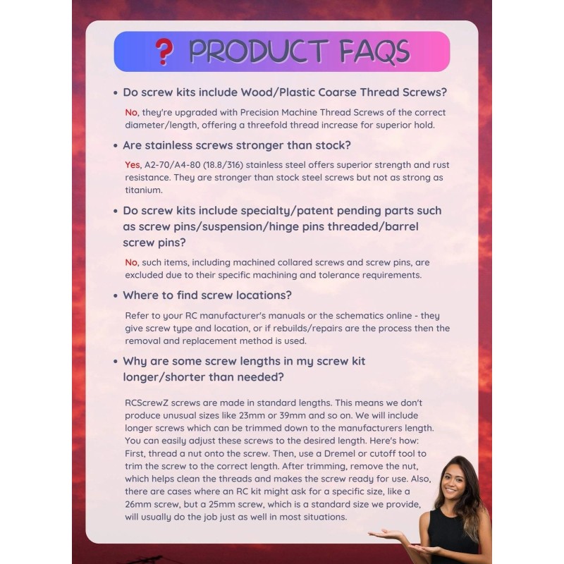 Our stainless steel screws are designed to resist rust, bending, and corrosion, providing long-lasting performance for your RC vehicle. 100% satisfaction guaranteed! These are great RC screws and fasteners for many customers.