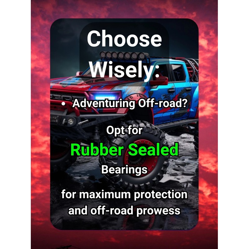 - Alternatively, our Rubber Shielded Bearings (SEALED) are your ultimate solution against dirt and debris, ideal for rough, off-road conditions. Pre-lubricated with high-grade grease, they are ready for action following a brief break-in period and are designed to deliver optimal performance under the most demanding circumstances.