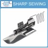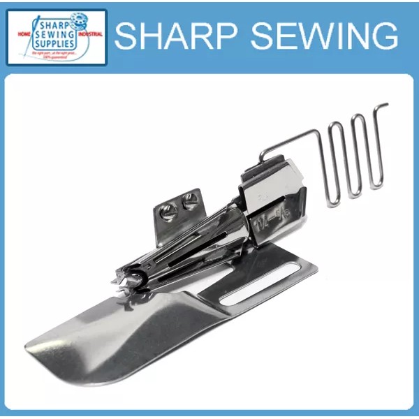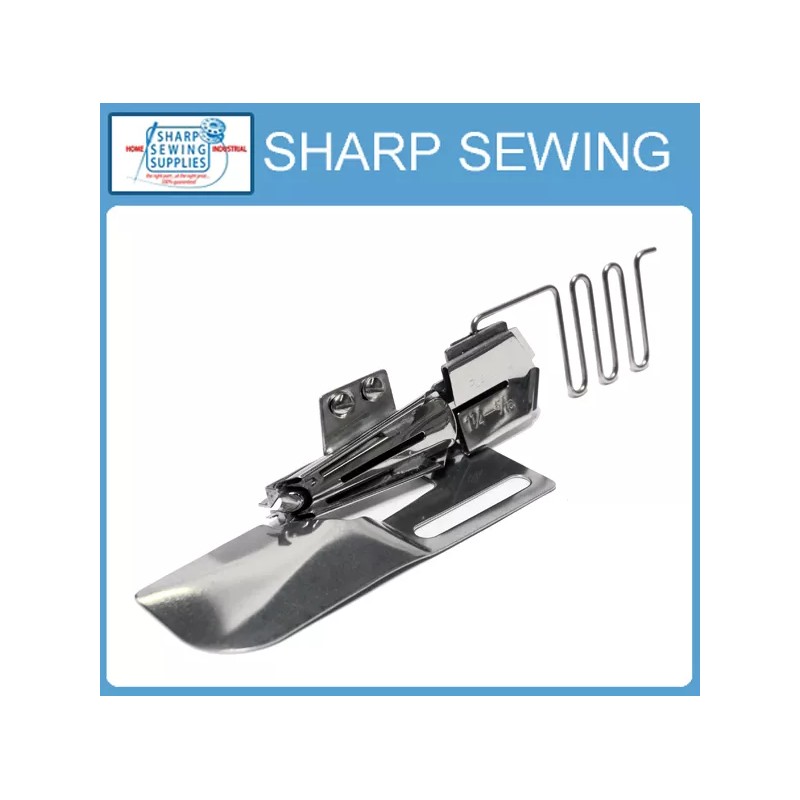 The Tape is folded TWICE on the TOP (Clean Finish) and TWICE on the BOTTOM (Clean Finish). This is the "B STYLE" standard "Collarette" Folderused on all kinds of T-shirts and Tops, especially Knitwear. There are two adjustable edge guides screwed onto this world class binder. One sliding guide sets the top edge of the fabric and the other sliding guide sets the bottom fabric edge giving the operator total control over the configuration of the binding. This binder sets perfectly folded binding onto the Collars, Armholes, and Bottoms of Knit Tops.