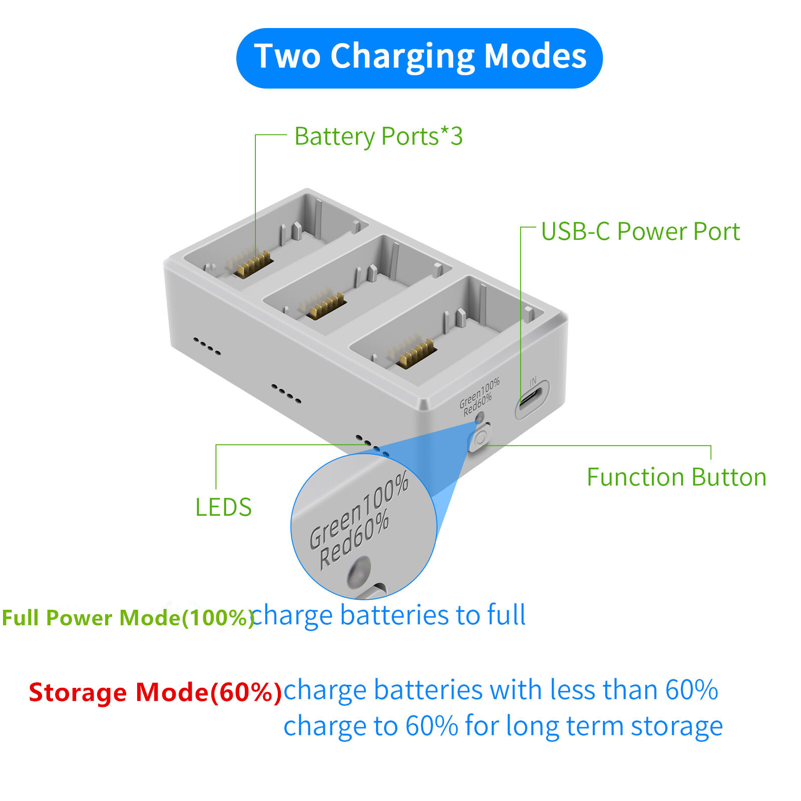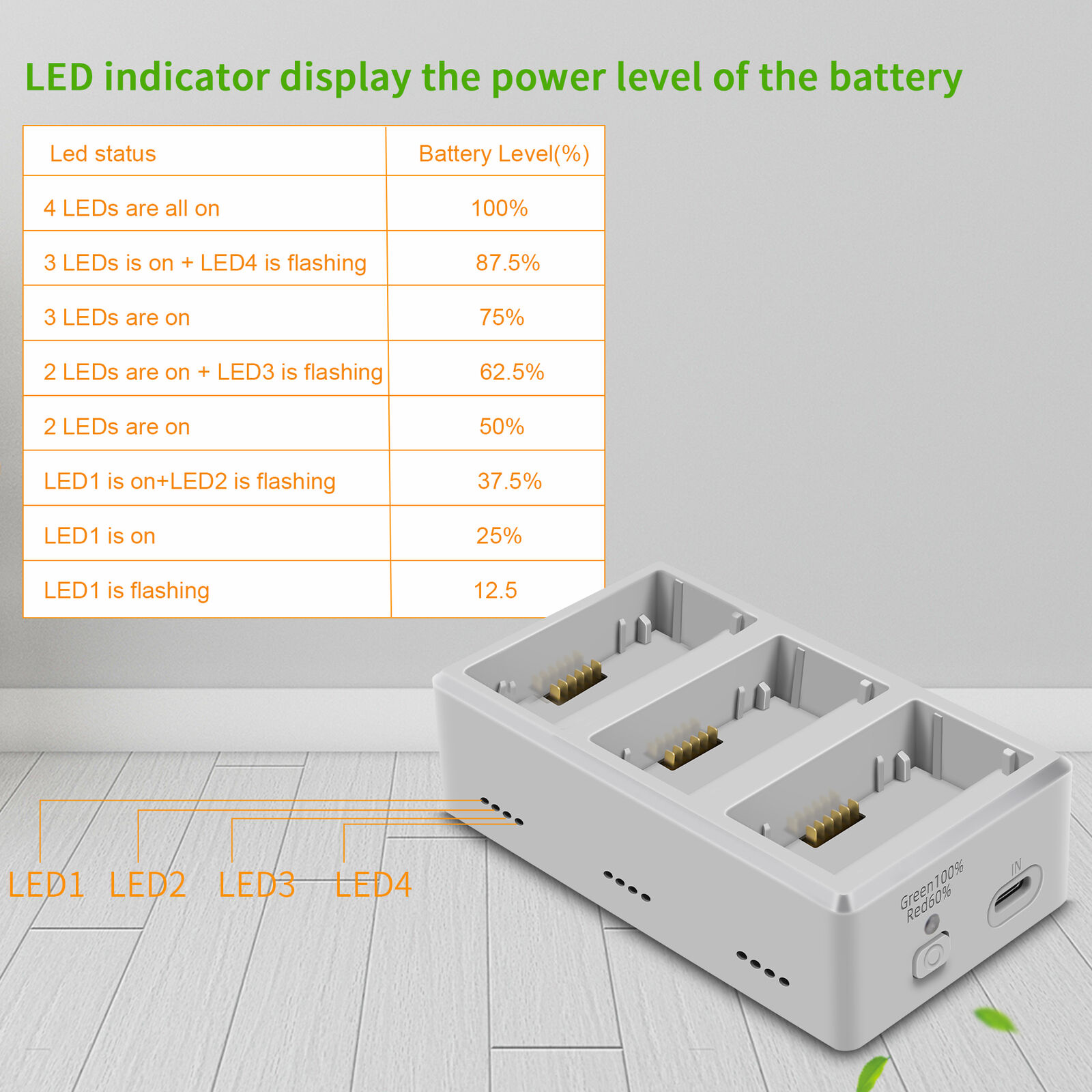 2. Up to 3 batteries can be put in and charged from high to low. Batteries with high power are charged first.