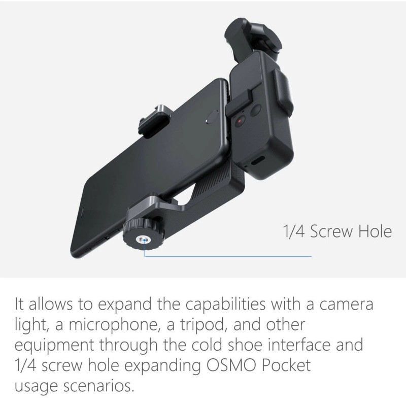 2, It allows to expand the capabilities with a camera light, a microphone, a tripod, and other equipment through the cold shoe interface and 1/4 screw hole expanding OSMO Pocket usage scenarios.