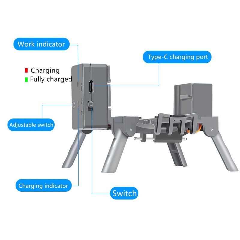 Landing gear effective fuselage heightened by 34mm, effectively prevent ground debris from contaminating the fuselage or damaging the gimbal and fuselage during take-off and landing